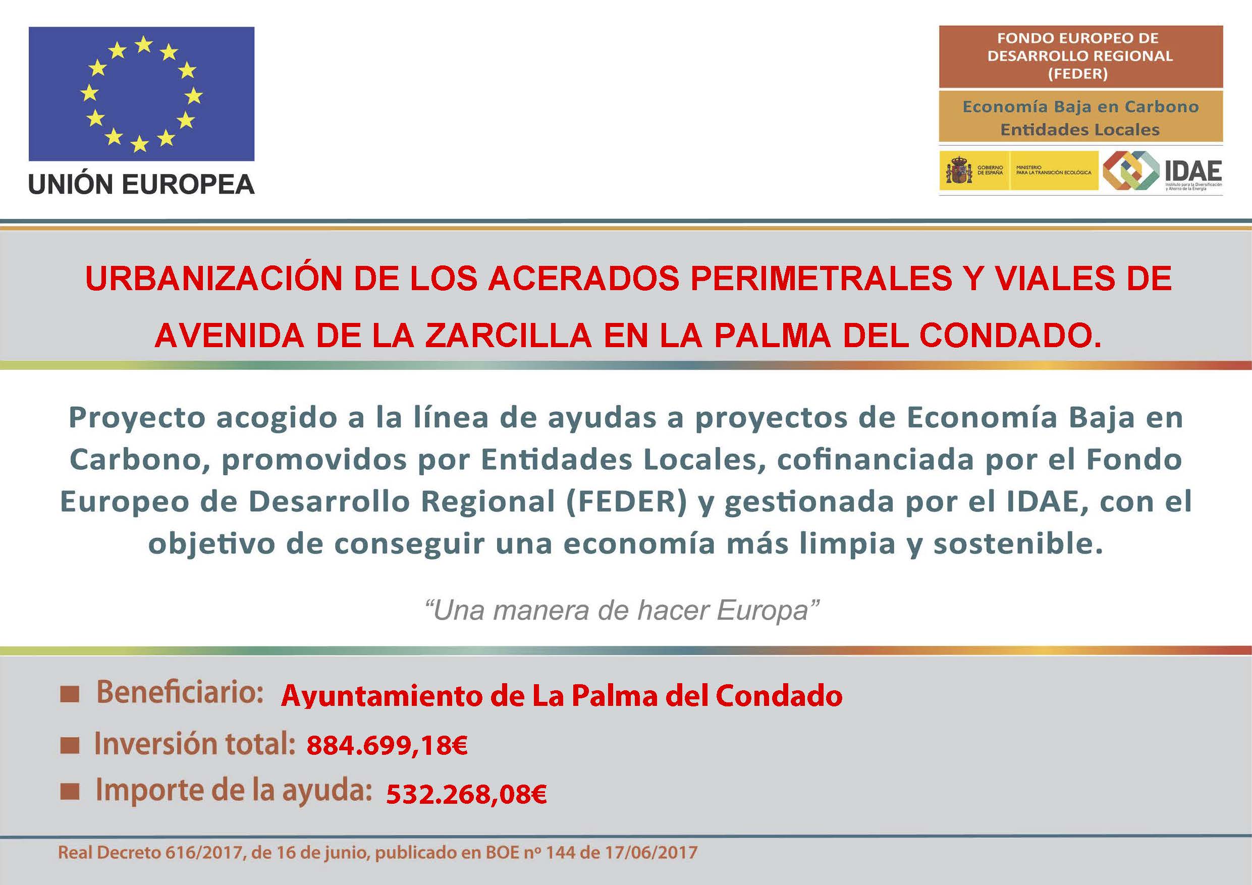 Proyecto Urbanización de los acerados y viales de la Avenida de la Zarcilla, cofinanciado por el Fondo Europeo de Desarrollo Regional (FEDER) en el marco del Programa Operativo de crecimiento sostenible 2014-2020, dentro del Objetivo Temático 4 - Economía Baja en Carbono.