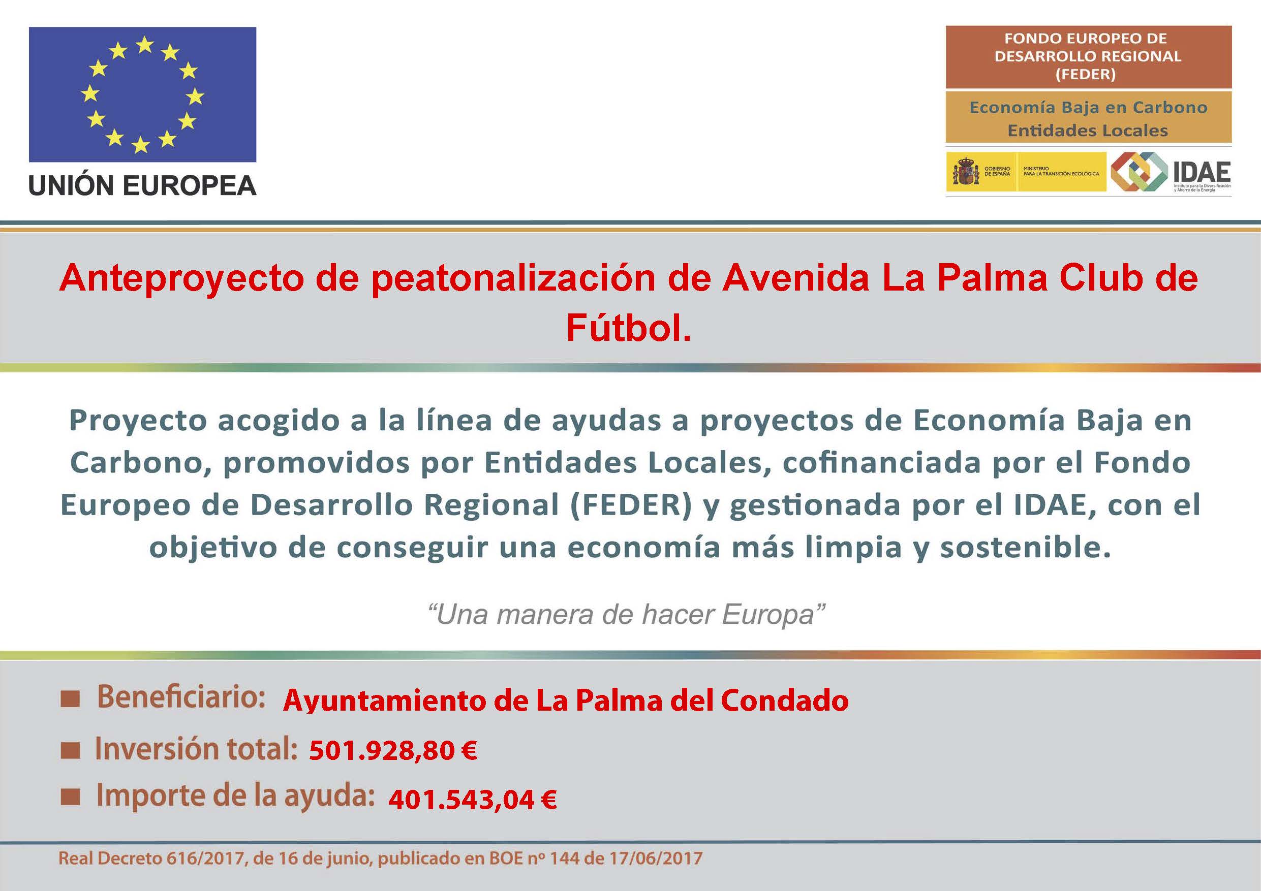 El presente proyecto recoge la actuación de la urbanización y peatonalización de la avenida La Palma Club de Fútbol en el municipio de La Palma del Condado, provincia de Huelva. Incluida en el Plan de Movilidad Urbana Sostenible del municipio.