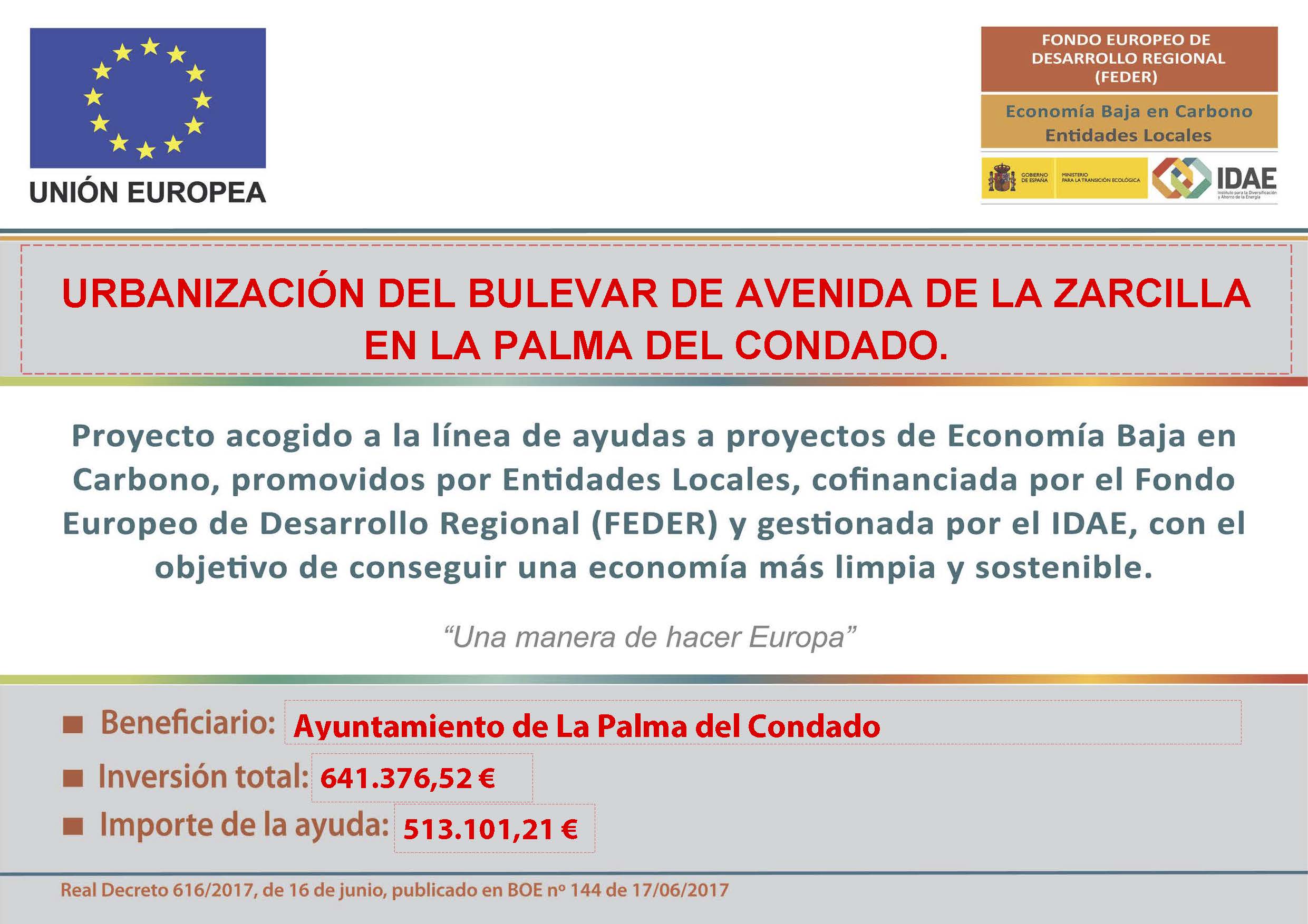Proyecto Urbanización del Bulevar de la Avenida de la Zarcilla, cofinanciado por el Fondo Europeo de Desarrollo Regional (FEDER) en el marco del Programa Operativo de crecimiento sostenible 2014-2020, dentro del Objetivo Temático 4 - Economía Baja en Carbono.